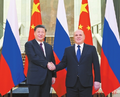 米舒斯京表示,今天我率俄罗斯政府几乎所有重要内阁成员一起同习近平主席会见,对习近平主席对俄罗斯进行国事访问表示热烈欢迎。习近平主席将俄罗斯作为连任后出访首站,意义特别重大,充分体现了新时代俄中关系的特殊性。俄中关系发展正处于历史最高水平,这有利于在当前国际形势下更好维护多边主义、促进世界多极化。俄中总理定期会晤机制在世界上独一无二。俄方期待同中方新一届政府密切协调合作,认真落实两国元首共识,加强两国全面战略协作伙伴关系。俄方愿同中方加强投资贸易、能源、天然气、和平利用核能、航空航天、科技创新、跨境交通物流等领域合作,就确保供应链产业链安全、粮食安全等问题加强沟通和合作。希望双方进一步密切文化、青年、体育等人文领域交流合作。