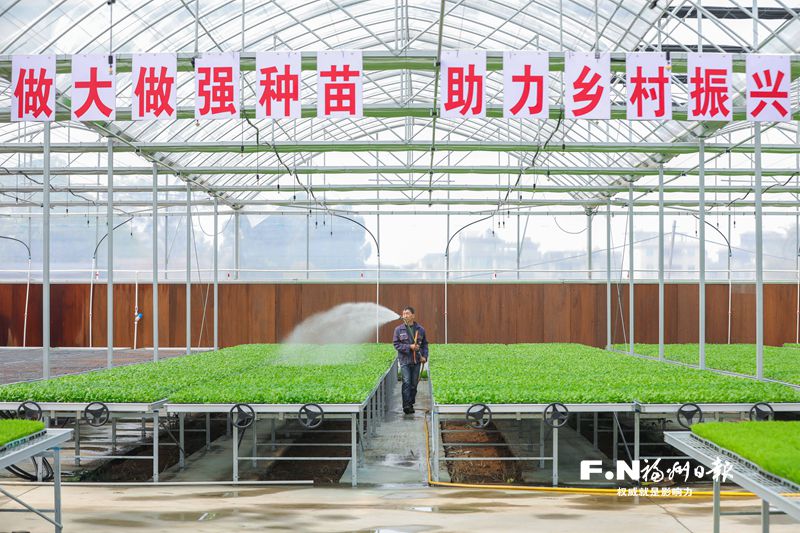 在福建蔬美农业科技有限公司琅岐基地种苗繁育中心,已出苗的秧盘整齐排列。 本报记者原浩摄